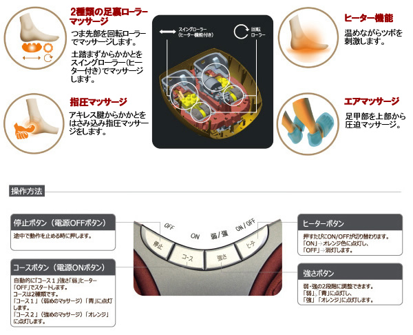 ![]() ![]() ライフフィットの「多機能&高性能フットマッサージャー FM-03」です。 回転ローラー+スイングローラーで足先・土踏まず・踵を同時マッサージ。 足の甲からアキレス腱を8枚のエアーバックでプレスする「心地よさ」。 保証について: メーカーが納品日を起算日として、1年間保証修理を承ります。保証書は、商品に同梱されております。 故障の際は当店もしくはメーカーへご連絡ください。